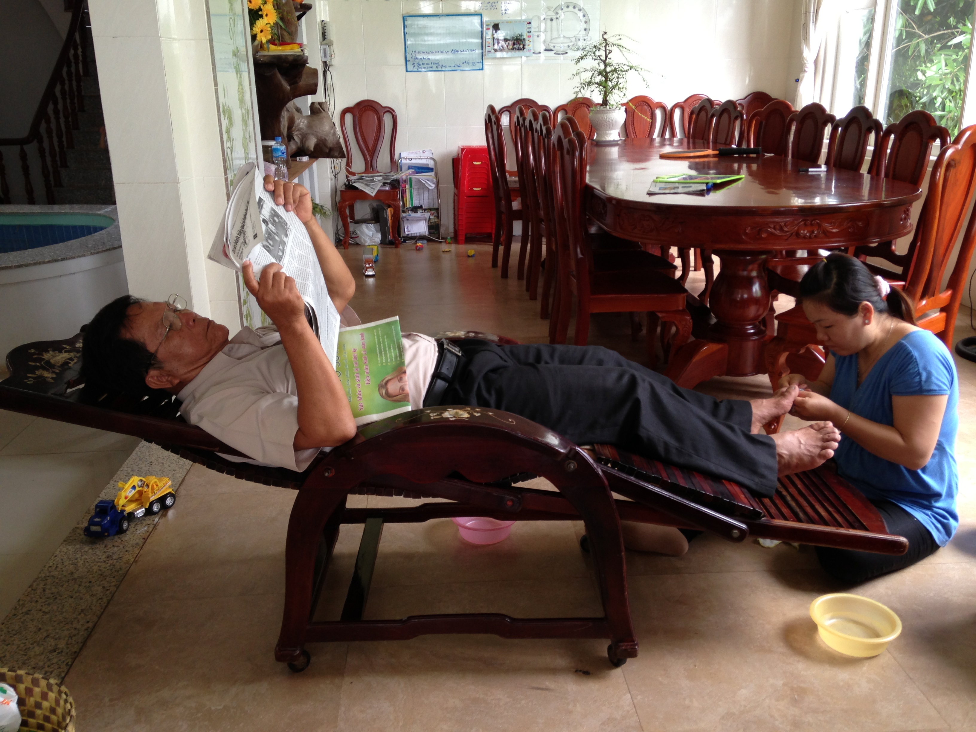We had spent a few nights in Long Khanh before embarking on our trip to Da Nang, with the intention of making it our home base for the rest of our stay in VN. Long Khanh is a couple of hours northwest of Saigon and a much more reasonable place to live. There are still mosquitoes and litter everywhere, but the roads and traffic conditions are much better. My very first day in Long Khanh, a manicurist appeared at my uncle’s home and gave me the most meticulous (and at less than a dollar, the absolute cheapest) pedicure I’ve ever had. As she worked on my toes, I snacked on luscious ripe papaya that had been picked from my uncle’s garden that morning and thought to myself, “A girl could get used to this.” After our Da Nang-Quang Ngai-Nha Trang-Phan Thiet “adventures,” we didn’t have the stamina to make it back to Saigon and decided to take the shorter trip back to Long Khanh to rest before our next expedition. The first day upon my return, the same manicurist arrived to give everyone mani-pedis. I had been honored the first time because I thought the manicurist had been summoned especially for me. This time, I realized that she had a standing appointment with the household for weekly in-home manicures, pedicures, and facials. My uncle and his family are a bunch of ballers.